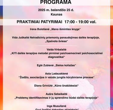 Jeigu domitės dailės terapija, naujais dailės terapijos srities moksliniais tyrinėjimais Lietuvoje ir užsienyje, ieškote papildomų idėjų ir žinių taikant dailės terapijos metodus arba ketinate studijuoti dailės terapiją, tuomet konferencija
